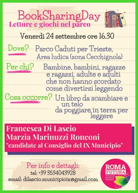 Venerdì 24 settembre, ore 16.30, Parco Caduti per Trieste, area ludica. Vi invitiamo al Parco Caduti per Trieste ad incontrare Francesca Di Lascio e Marzia… Leggi tutto »BookSharingDay – Letture e giochi nel parco